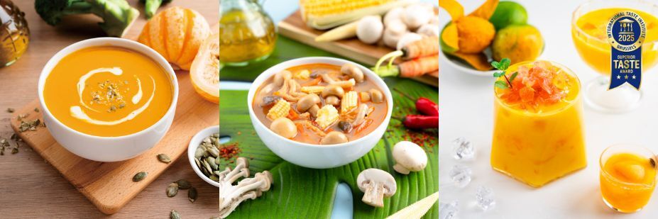元氣南瓜濃湯:最應景的湯品!濃郁香甜南瓜湯融合鮮奶油香氣,溫暖又飽足,適合秋冬時節的萬聖節聚會。