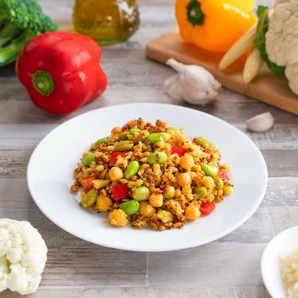 特選清新爽口白花椰菜米,搭配鷹嘴豆、毛豆、超級穀物紅白藜麥、紅小麥,以異國風情茴香、孜然、薑黃等香辛料及義大利初榨橄欖油做調味,使香氣更為清爽,花椰米具咀嚼口感,是替代白飯的好選擇,優雅輕嚼,更能感受花椰米的清爽風味。