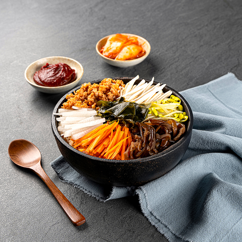 Selected white rice is paired with crunchy bean sprouts, red and white radish, shredded black fungus, tender king oyster mushrooms, and seaweed for a layered texture experience. Topped with a specially crafted Korean spicy sauce, it’s both spicy and infused with rich sesame oil aroma—a dish that’s n