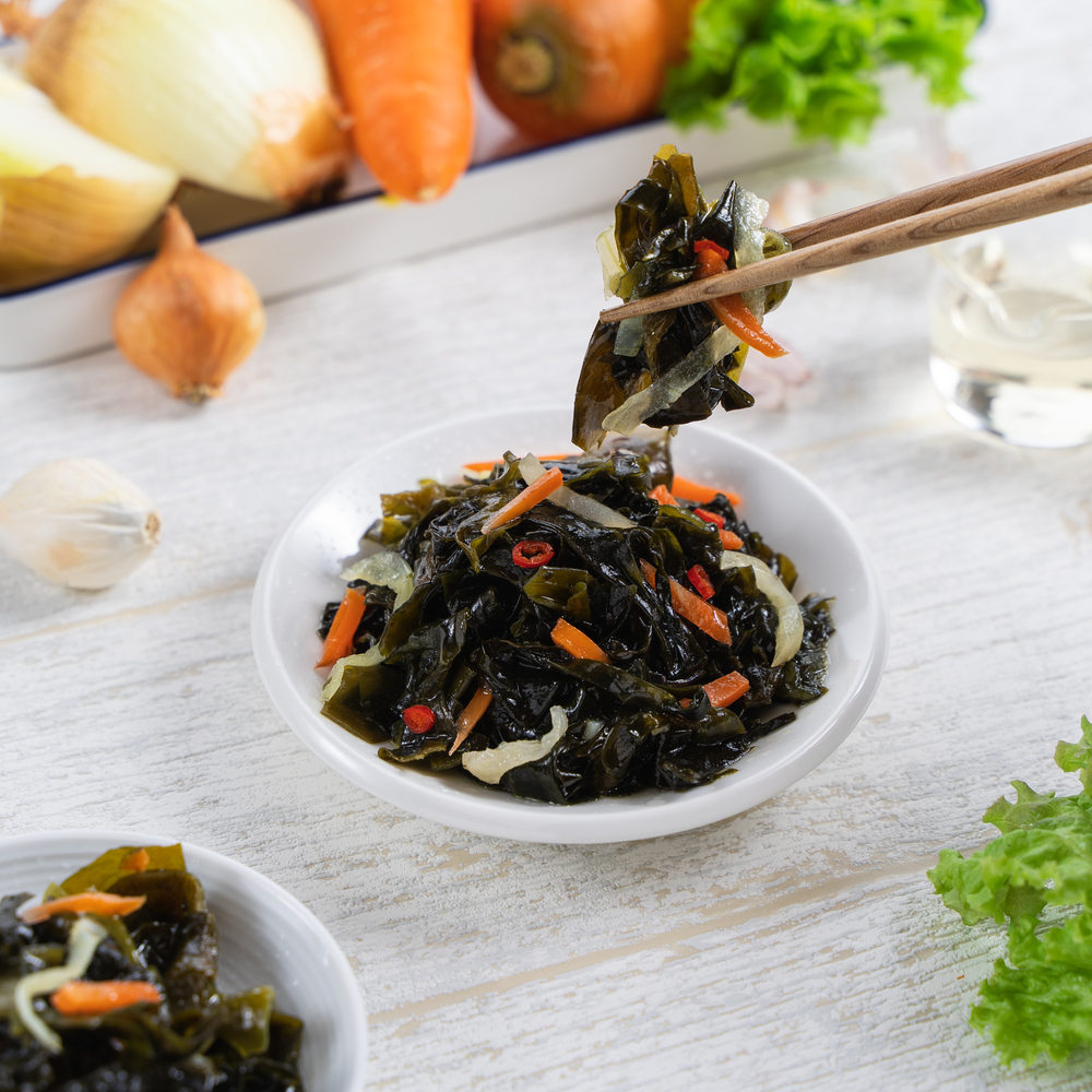 將來自海洋的美味裙帶芽,浸漬在獨特酸味醬汁裡,輔以清甜洋蔥、紅蘿蔔絲、白蘿蔔絲,是一道清爽解膩的開胃小菜。