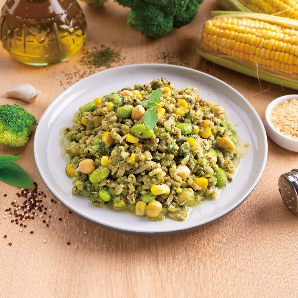 將白花椰米取代米飯成為主食,加上杏鮑菇、大麥、非基因改造毛豆、鷹嘴豆等食材增添層次與咀嚼口感,再以新鮮九層塔、初榨橄欖油、腰果、義大利香料調製燉煮而成的青醬,融入起司粉、鮮奶油更顯濃郁滑順可口,多重口感與層次,香氣醇厚,飽足感十足。