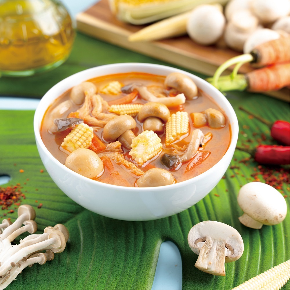 嚴選經過多道特殊揉製攪打工序之植物肉片,搭配蘑菇、玉米筍、紅蘿蔔、姬菇等營養蔬菜,加入香茅、檸檬葉、南薑、檸檬、辣椒、椰奶等食材熬煮出泰式風味湯頭,香氣四溢,酸辣濃郁,素食者也可安心享用異國美味。