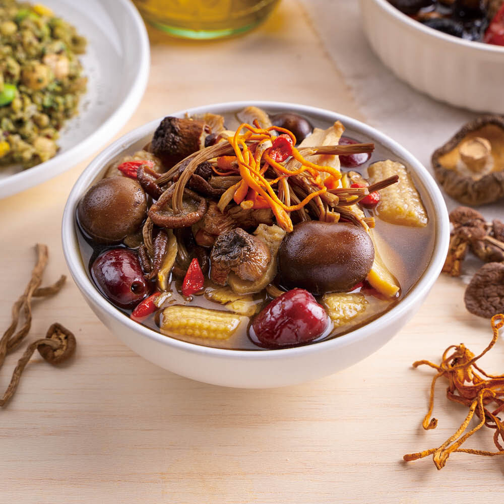 使用頂級黑麻油溫炒煸出薑片的香氣,輔以特級嚴選黃耆、當歸、甘草及茯苓等天然食材,並加入香菇、姬松茸(巴西蘑菇)、茶樹菇(柳松菇)等多種蕈菇,溫和清甜湯頭告別傳統藥膳的中藥味,一口喝下,溫潤甘甜。