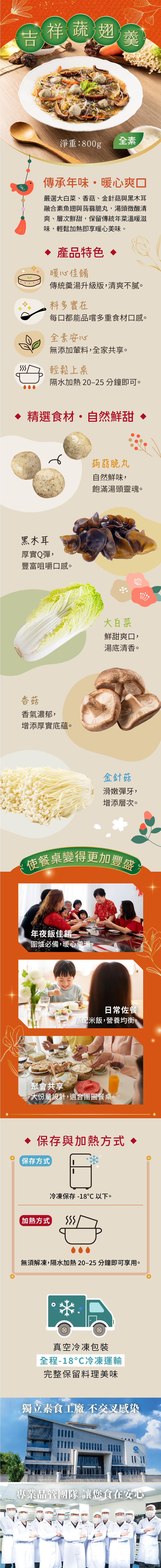 嚴選大白菜、香菇、金針菇與黑木耳,融合素魚翅與蒟蒻脆丸,湯頭微酸清爽、層次鮮甜,保留傳統年菜溫暖滋味,輕鬆加熱即享暖心美味。