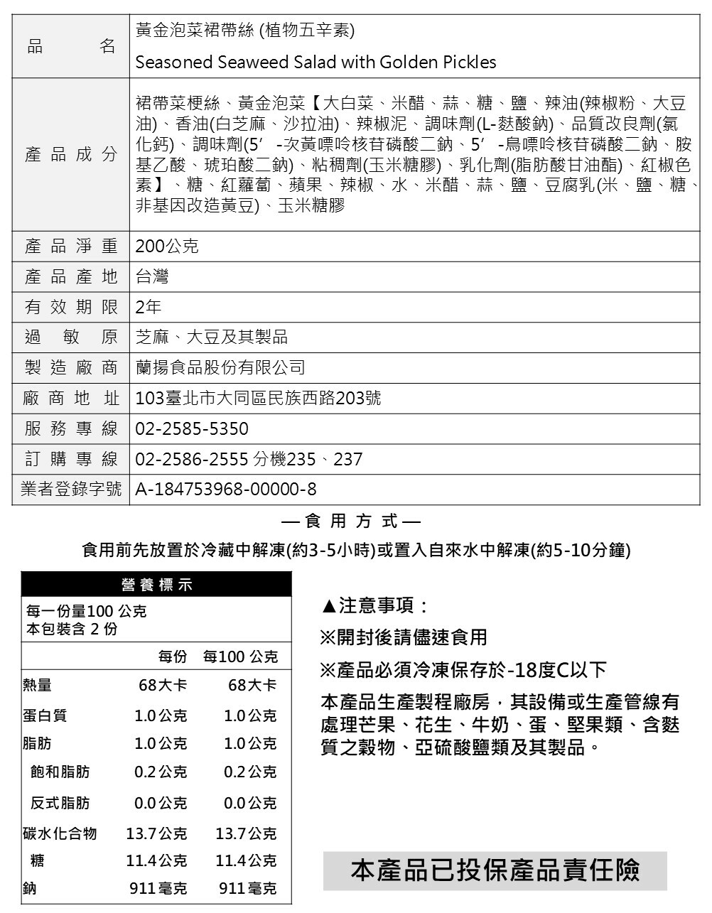 精選來自海洋的天然美味裙帶絲,加上秘製而成的黃金泡菜,酸甜鮮美脆口的黃金泡菜與裙帶絲清脆爽口形成多層次口感,金黃色澤酸甜口感,挑動食慾。