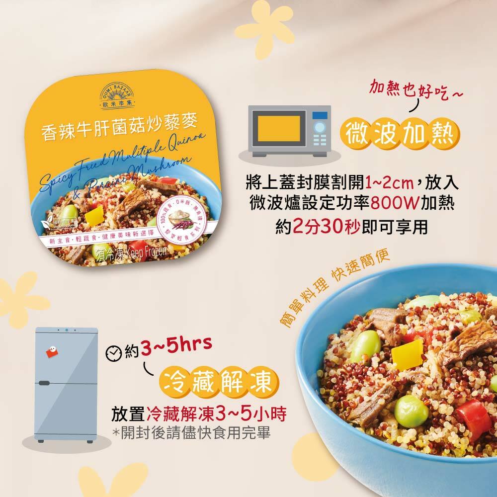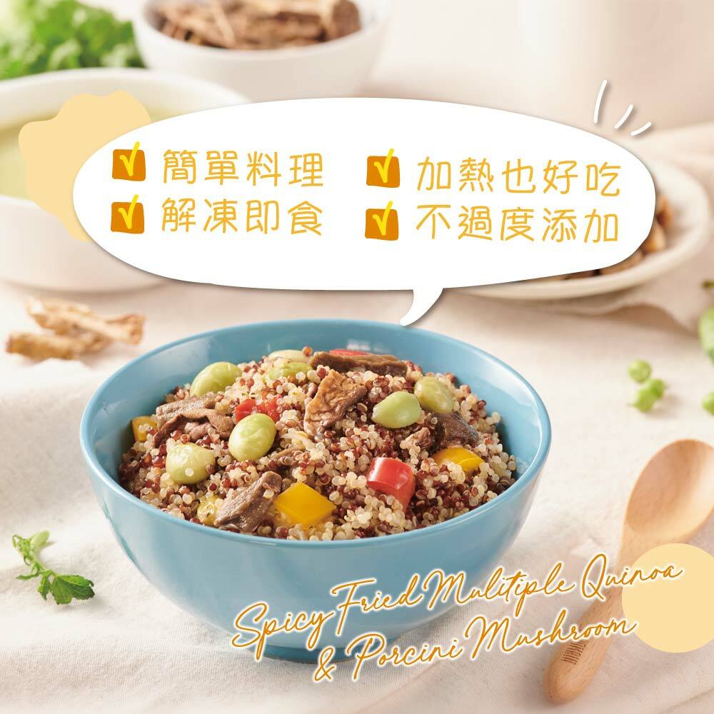 特選營養穀物紅白藜麥及國產的非基因改造毛豆為主食,加上紅椒及黃椒來增添色彩,輔以義大利初榨橄欖油將蒜、洋蔥及辣椒、蒜蘇煸炒出香味,再加入法國進口牛肝菌菇,襯托濃郁蒜香味及香辣味,展現出超越傳統義式清炒風味特色,色香味俱全的搭配,健康又美味。