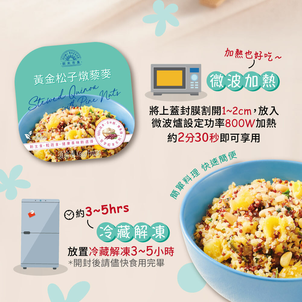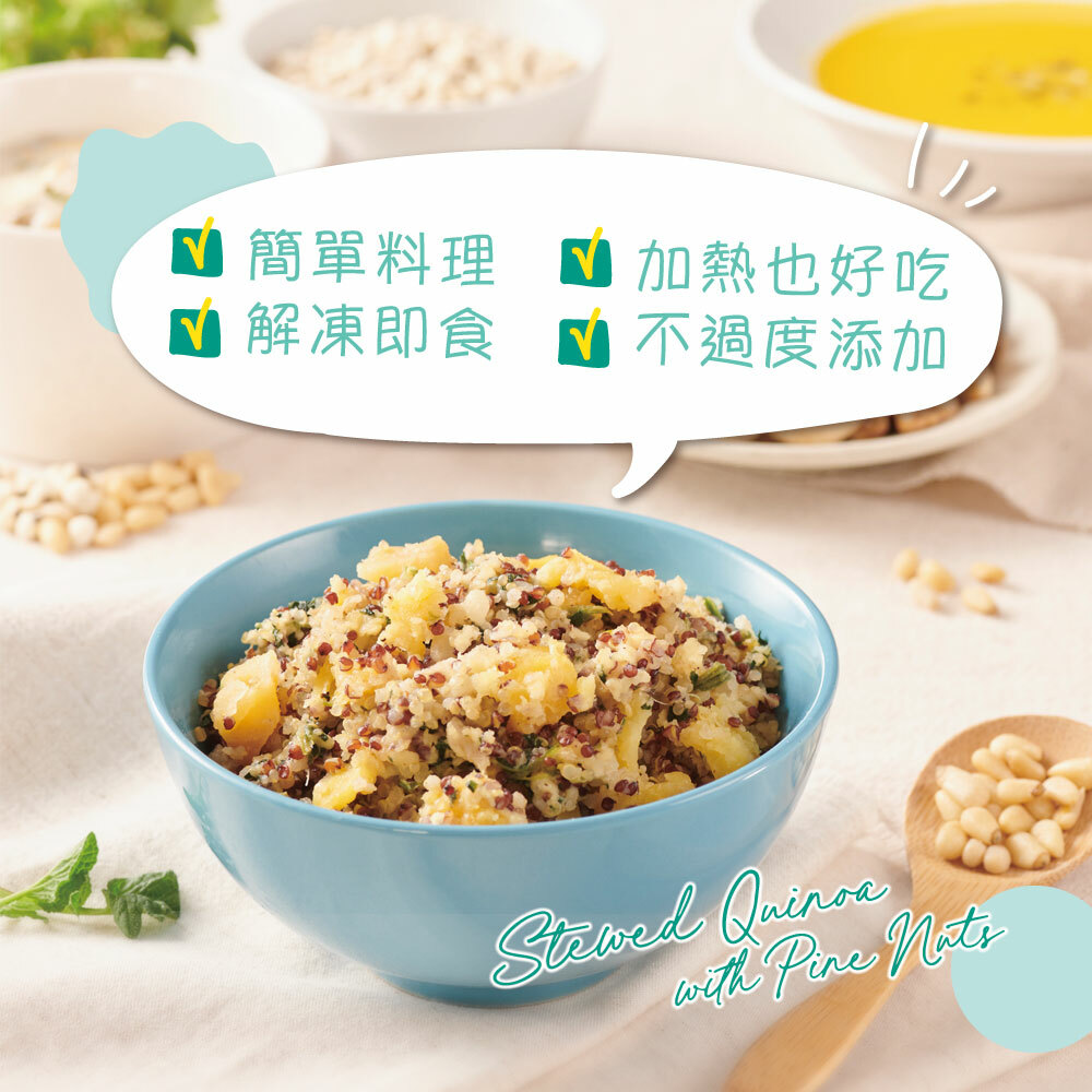 以超級穀物紅白藜麥及小薏仁為主食,加上鬆軟地瓜丁及菠菜,增添不同層次的咀嚼口感,佐以滿滿松子、起司及優質奶油,使香氣及口感更顯濃郁,是一道新興健康燉飯料理。