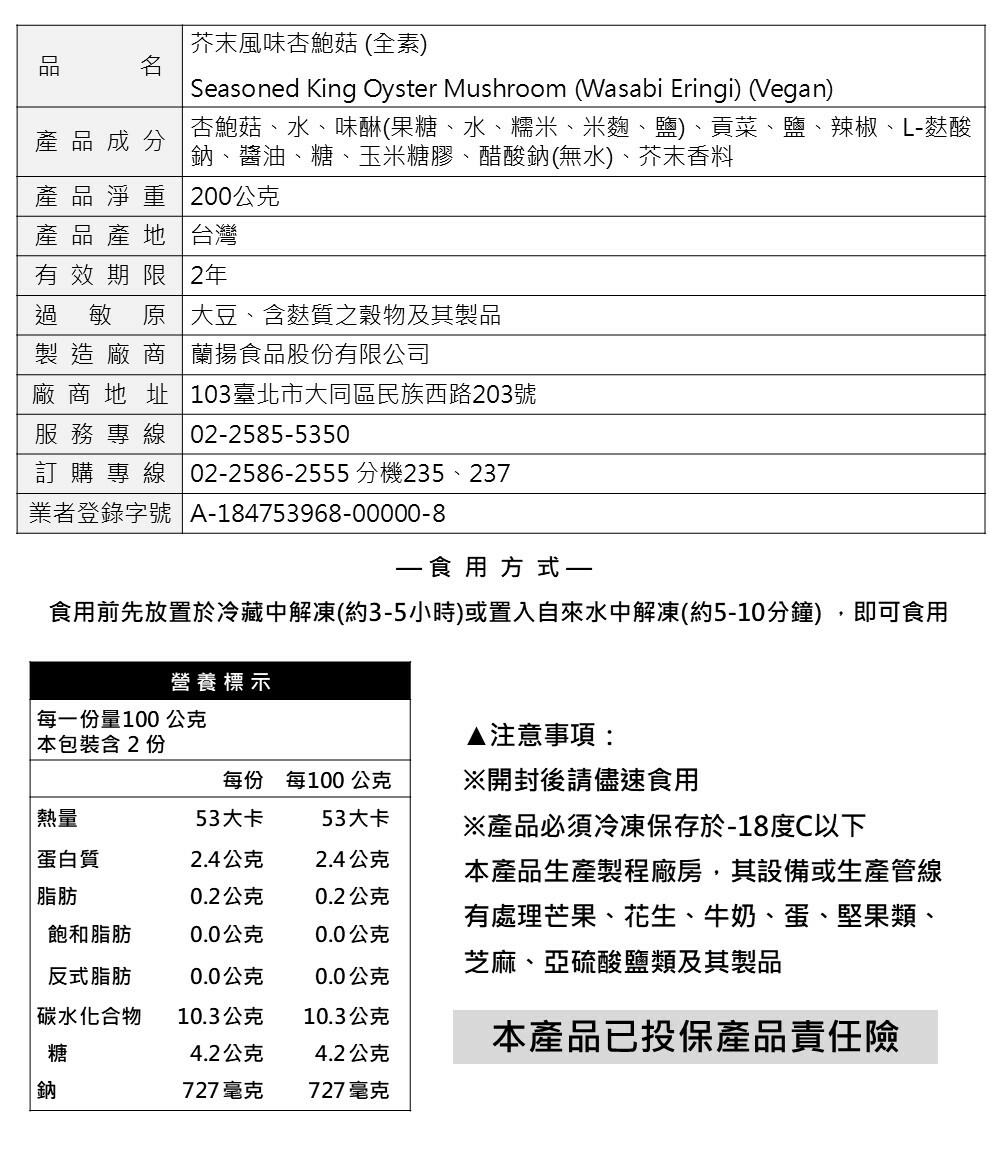 嚴選杏鮑菇質地細膩脆嫩、口感肥厚如鮑魚,具有獨特香味,加上杏鮑菇營養價值高而受大眾熱愛,特選佐以獨特辛香辣爽之芥末風味,創造出柔嫩彈牙,鮮美而膾炙人口、令人再三回味之絕佳菜餚。