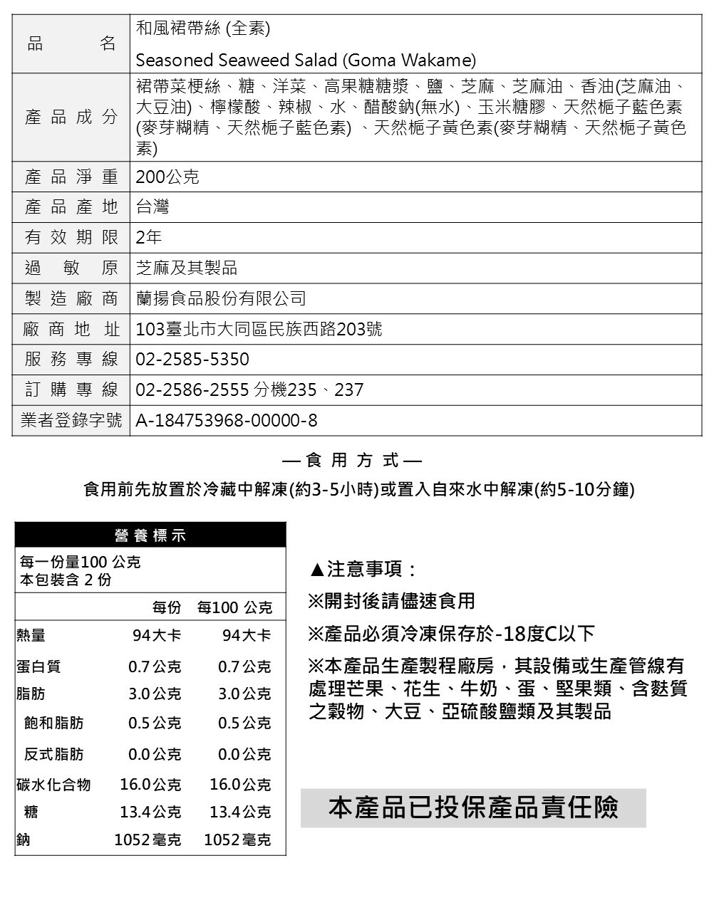 精選來自海洋的天然美味裙帶絲並搭配健康爽口洋菜,不同咀嚼度形成多層次口感,再加以點綴焙炒芝麻及芝麻油來增添醇厚風味,清新爽口、健康營養。